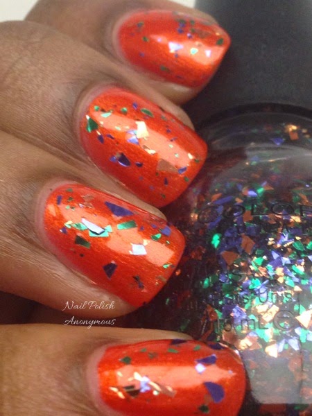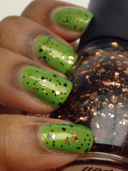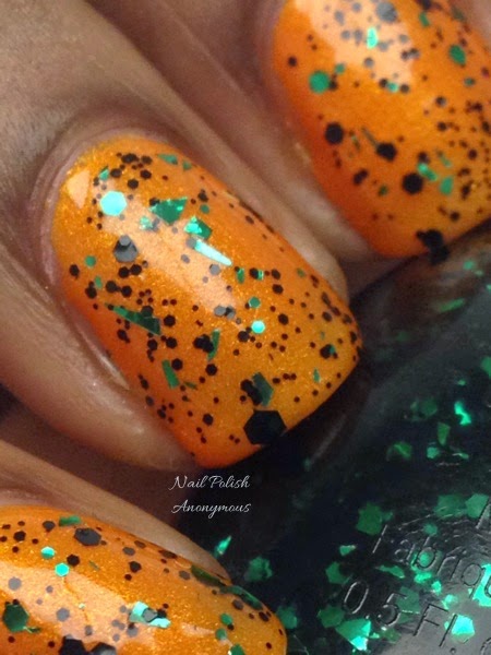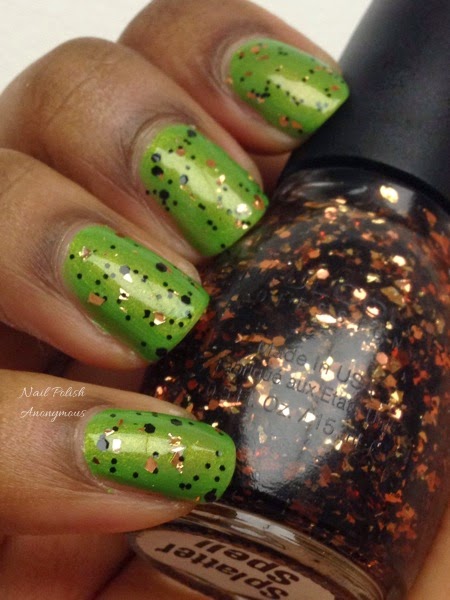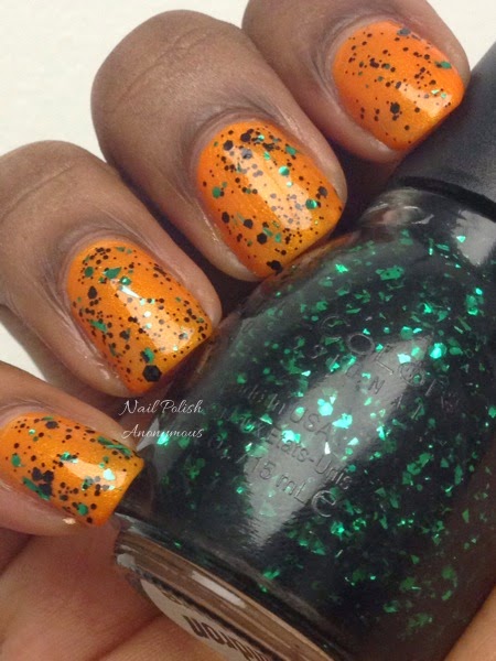 For this challenge I used the Halloween Sinfulcolors that I reviewed, if you wanna check the review check it out here, I used Happy Endings as my base coat, Splatter Spell for the glitters, and Sally Hanse's Night Fright Fast Dri and Straight Vinyls for the lines. All my lines are at an angle, I won't lie after the ring finger and middle finger I wanted to scream because the single vinyls didn't want to lay straight, I think next time I'm going to get the ones that are as big as the finger nail that you lay down.