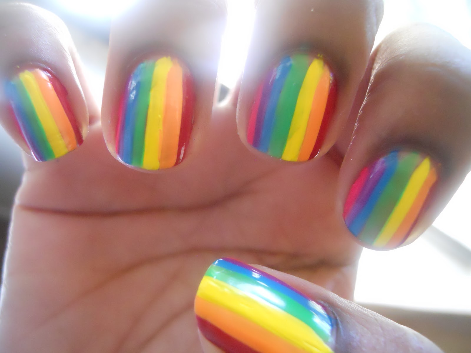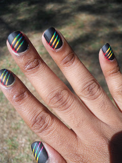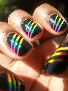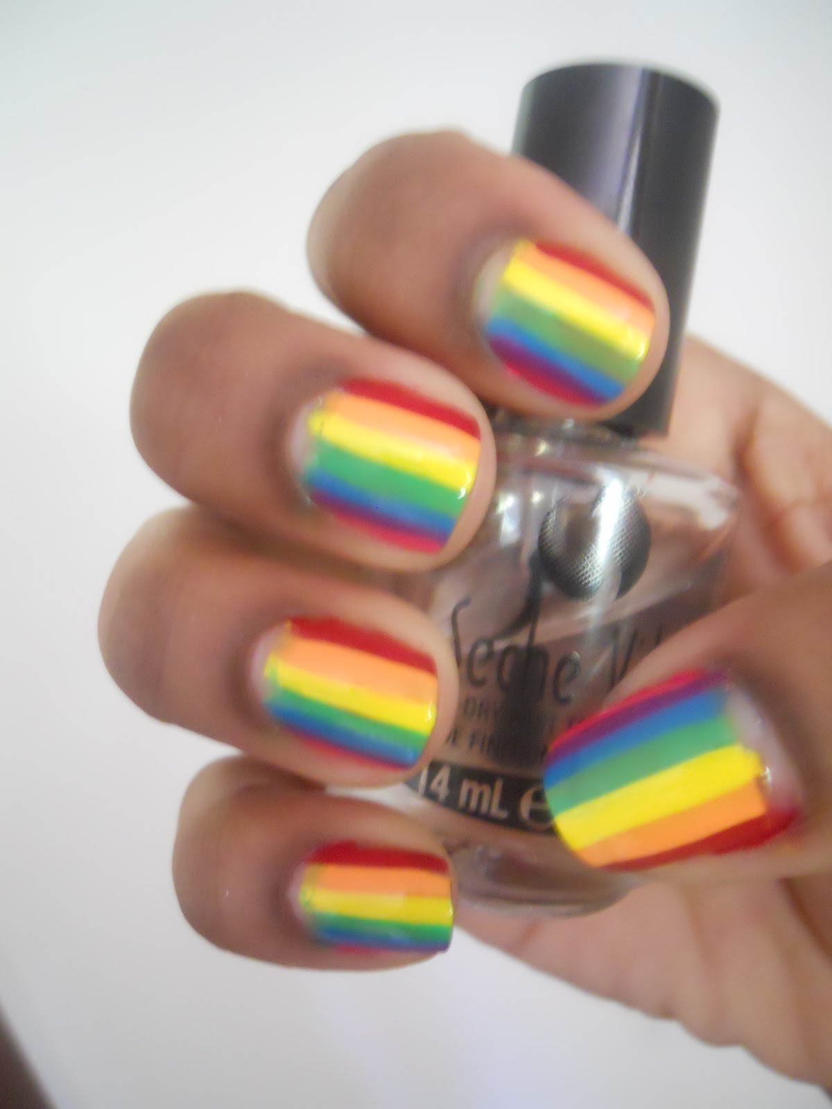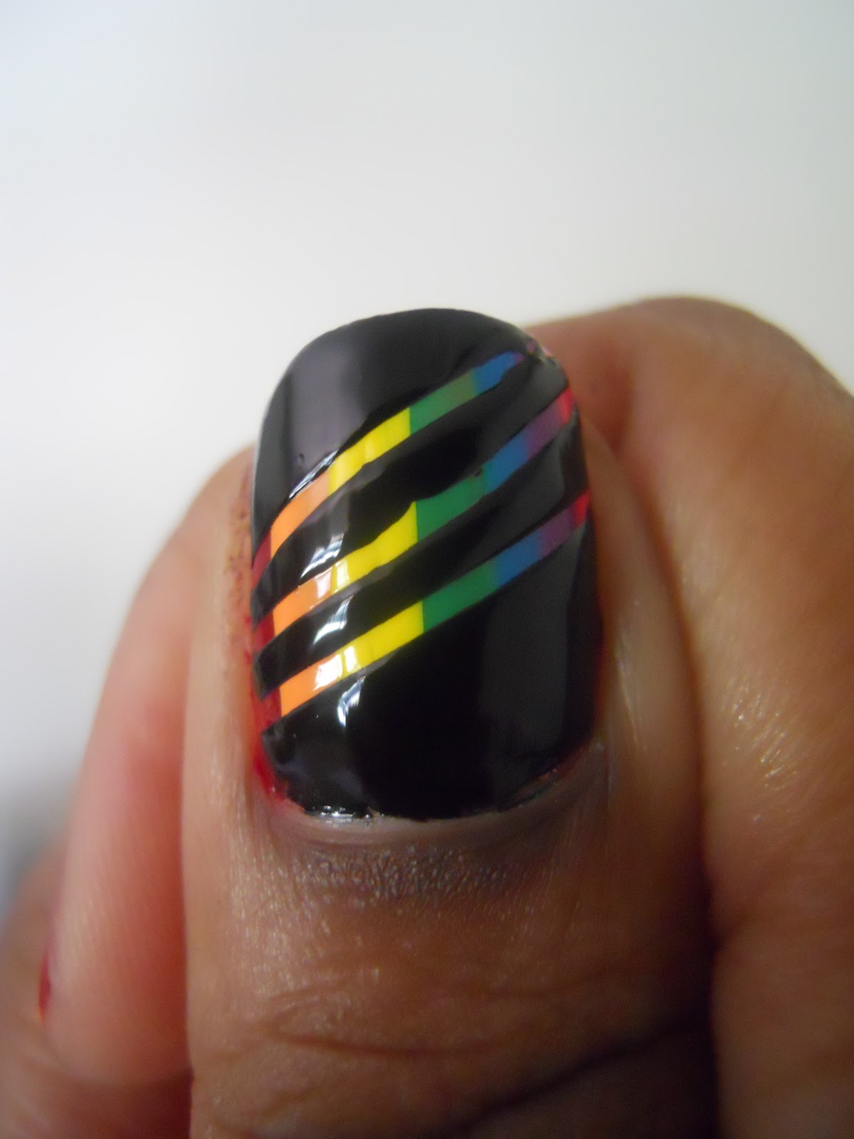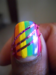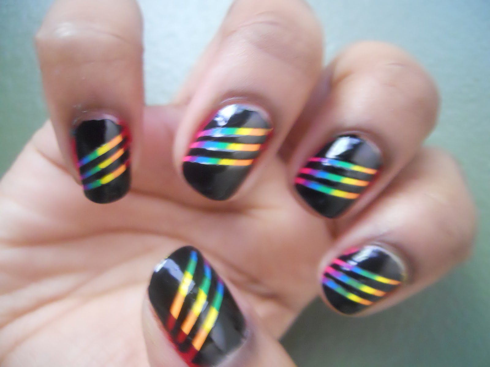 Now this design is pretty simple, all you need is paint, stripping tape, and again patience. Here's how to do it.. First you can take nail art paints(what I used) or any polish and a thin brush to make rainbow lines down the nail... you can have as many lines as you would like 2,3, or the whole rainbow like these....