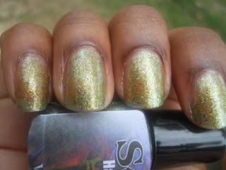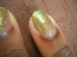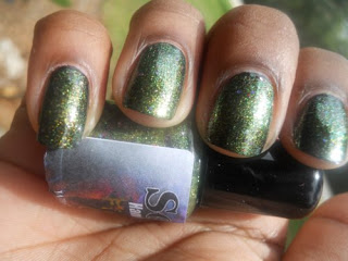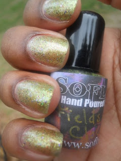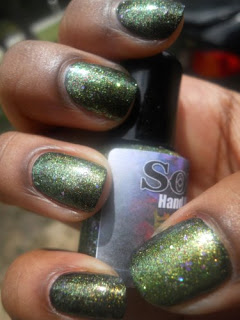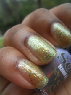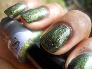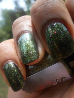I love how her polishes are packed with these hidden little surprises, the purple glitters are like holo's so in the sun this polish is beautiful it's like the little rainbow flowers you can find in a pack of clovers. Makes me what to lay in the grass if it wasn't for those pesky fire ants, so I will stick to sprinkling glitter in my grass instead and comparing it to my nails.