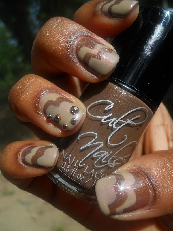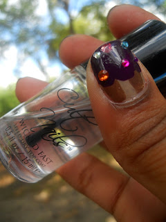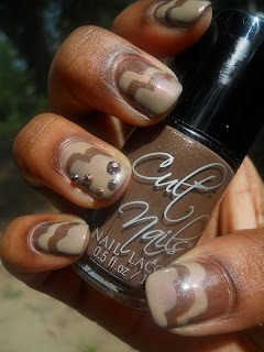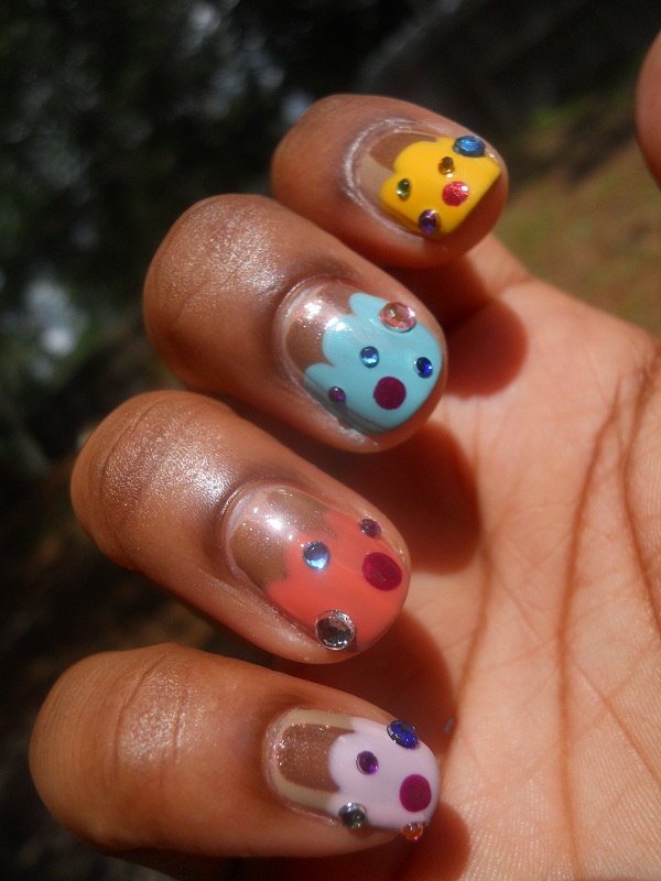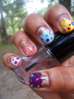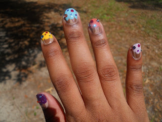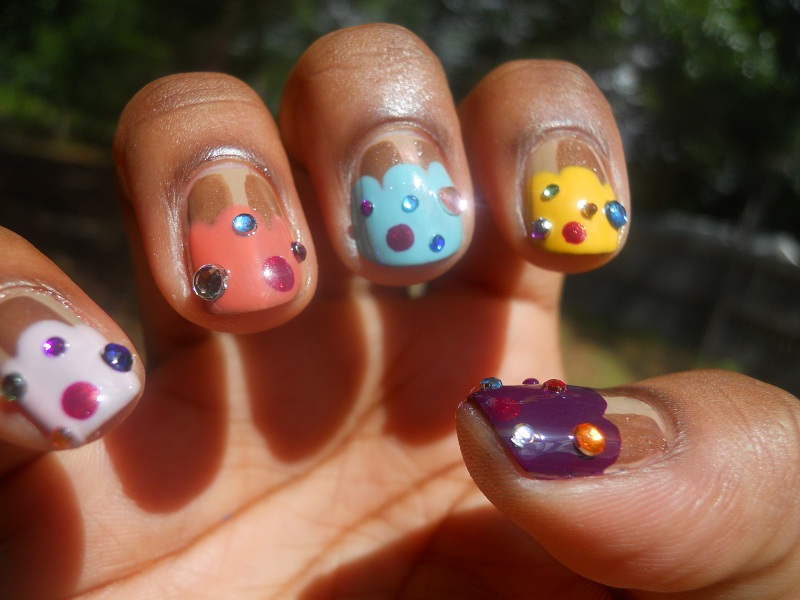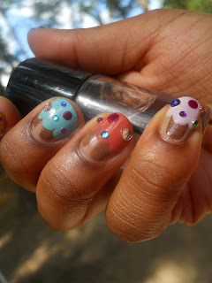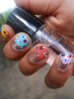 It takes a lot to make some colorful cupcakes. I used Cult Nail's Crusin' Nude and In a Trace for my base then Feel Me Up, Manipulative, Scandalous, Enticing, Vicious for the frosting and Ionic for a cherry, last I used the Rainbow Multi-size rhinestones for sprinkles.