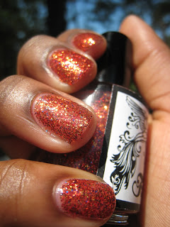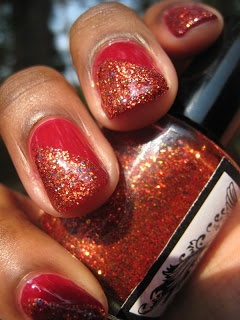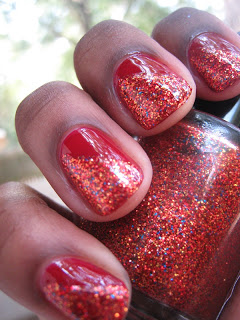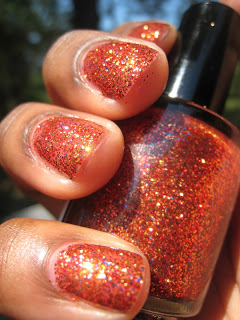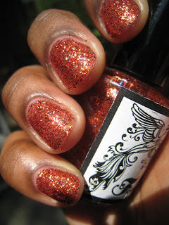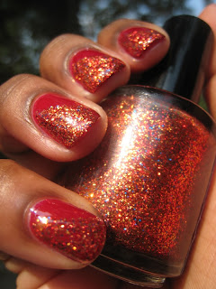 The next polish we have is Flames. Flames is a full coverage glitter polish with a red tinted base full of red, gold, copper glitters with sparse blue glitters to add to it's charm.