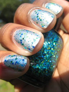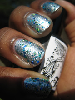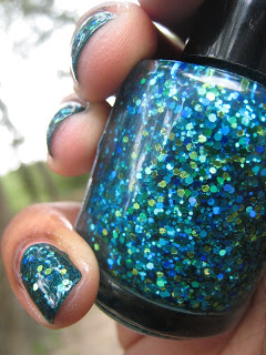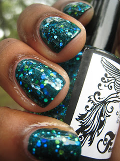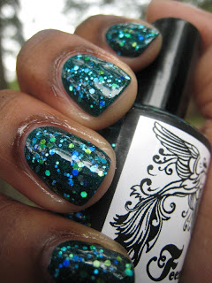 First up is Shake Your Tail Feather. Shake Your Tail Feather is the one that brought me to Feenix polishes, I just love peacock colors. This polish is full of different blues and greens glitters and just scream out look at me I'm sexy and I know it! This polish just makes me drool.