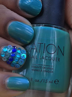 Hello Dolls hope your feeling better than me, I swear I could catch a paper cut, but today for the Blue challenge I didn't want to use your everyday ordinary blue I wanted to use Teal. Did you know that September is Ovarian Cancer Month and *drum roll please* Teal is the honorary color. So Today I give you Sation's Miss McTeal with a Bundle monster blinged out accent. Miss McTeal was the perfect color it's a greenish blue base with blue shimmer, simply the best teal.