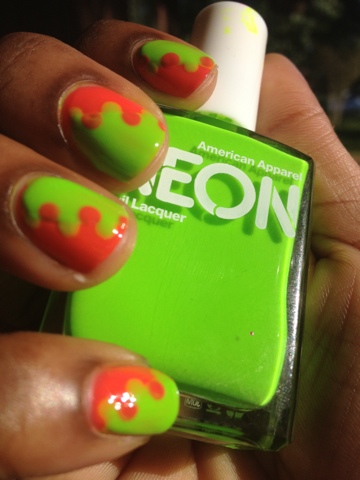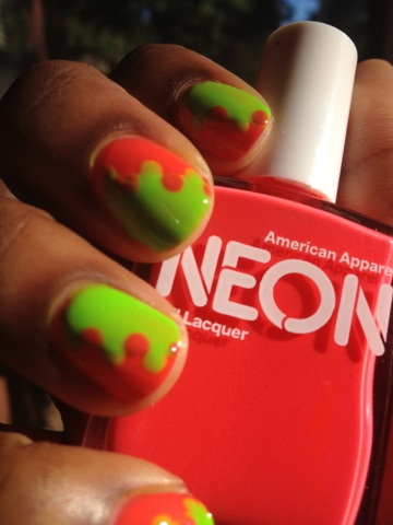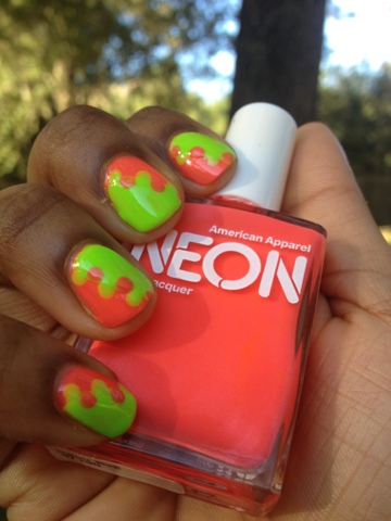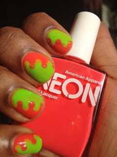 I used American Apparel's Neon Rose and Neon Green. As you can see my neon green was a little thick so you can see the overlap but all in all I used neons. But this design reminds me of Nickelodeon's Slime, which brings back memories and makes me think of Amanda Bynes *sighs* but I do like this design when using neon's, if only I used a polish that was more cooperative but the neon green is so fun and I never had any problems using it on it's own, oh well. Make sure to check out the other fabulous gals joining me in this challenge and their bright designs.