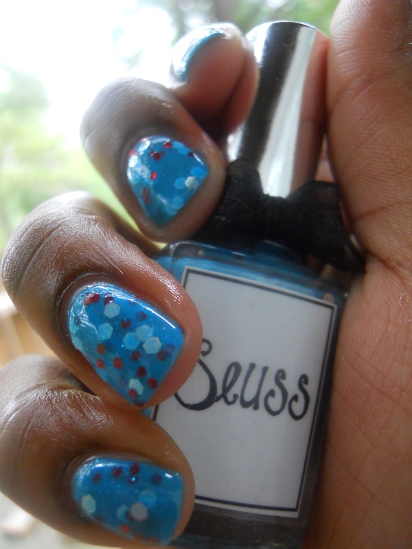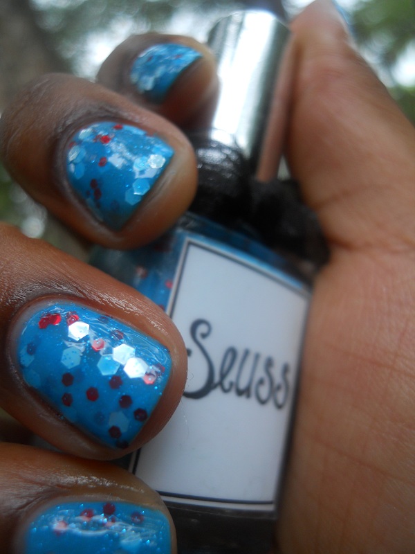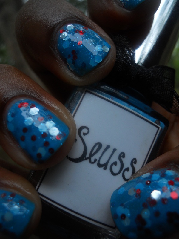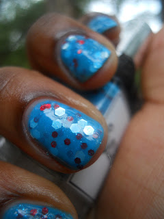 As a navy brat and friend this weekend was very emotional and heartbreaking remembering the lost and thanking the present and past and also remembering a young soul who was lost this week but it was even more trying because the weather seemed to reflect my mood... rainy, rainy and some more rain but that didn't stop me from putting something fun on my nails to lift my spirits. I wore Whimsical Idea's by Pam Seuss and it did put a little smile on my face every time I'd catch a glimpse of them. I love this fun polish, it's a candy blue jelly with blue shimmer sparkles, small red and big silver hexagons.