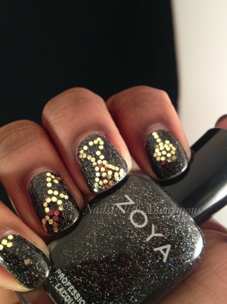 So today is all about the Count Down!! *Cough Cough* and sparkles. So I just had to use Zoya's Storm, I mean c'mon do you know of any other black polish with the most amazing holographic glitter that doesn't take away from the color but adds to it's glitz and glamor? I also used Milani's Gold and used the glitters for designs and here's what I ended up with....