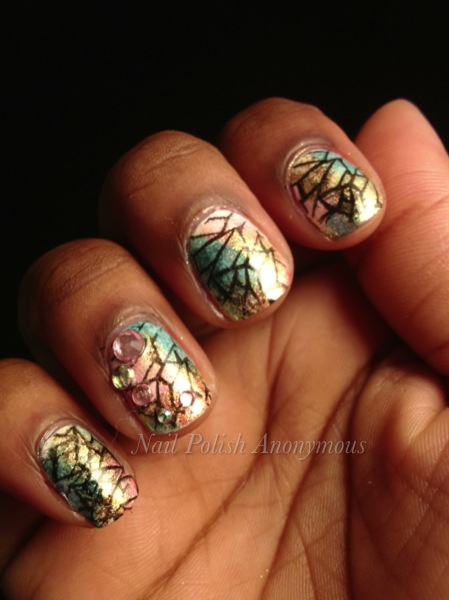So today is Day 2 of the Flip Flop February Nail art challenge and I've never done stained glass nails before so I figured I'd try out the Bundle Monster stamping plate 208. I also decided to add a bit of sparkle to create a quick accent nail and here's what I came up with....