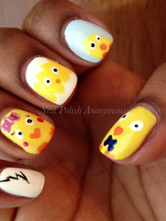 I used a little too much top coat on little miss chick, I was afraid to smug her cheeks. I used Zoya(surprise) for this mani, I used Pippa, Song, Jancyn, Blu, Purity, Dana, Raven and I also used a silver stripping brush for the accent in the bow.