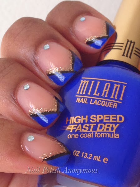 A very simple different twist on a french tip, using Milani's High Speed Fast Dry Blue Zoom, a Milani black stripper and Orly's 24k stripper, along with some baby blue rhinestones to add a little something, something.