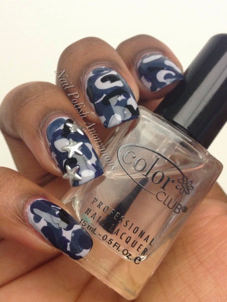 Today's nail art theme is Armed Forces/Memorial day, so I've decided to do a navy camo mani since I have a bunch of family that has served in the navy from my great-grandfather, my grandfather, my dad and my aunt(I also have members that were in the Air Force). I have a lot of respect and thanks for our armed services and I'm truly thankful for everything they've given up for us, so we can have the life we have. So here's my Navy Camo mani.