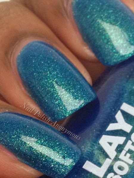 This aqua blue with a green shimmer undertone is screaming oceans and mermaids.