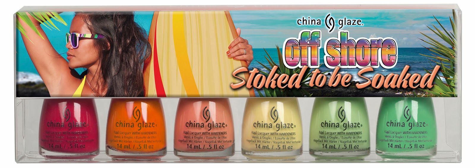 Hello darlings! Summer is so close(At least in my part of the world) only 19 days away!! And with that I have the China Glaze Off Shore Collection to share with you. I've decided to split this collection into 2 parts, because there are 12 polishes in this collection. You can either buy them all, of course or separately but you also have the option of buying one of the two 6 packs, which is how I split them up. So today I'm going to show you the Stoked to be Soaked, with is 6 polishes which in my eyes looks like the beginning of the rainbow.