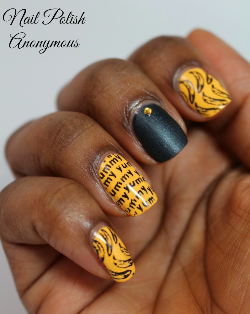 Next I used Mentalitys' Black Opaque polish to stamp on some banana's and yummies. I also wanted something to make it all flow together so I used Zoya's Dovima with a yellow rhinestone because everything looks better with a little bling. I also topped off all the other fingers with Kbshimmer's Clearly on Top quick dry top coat.